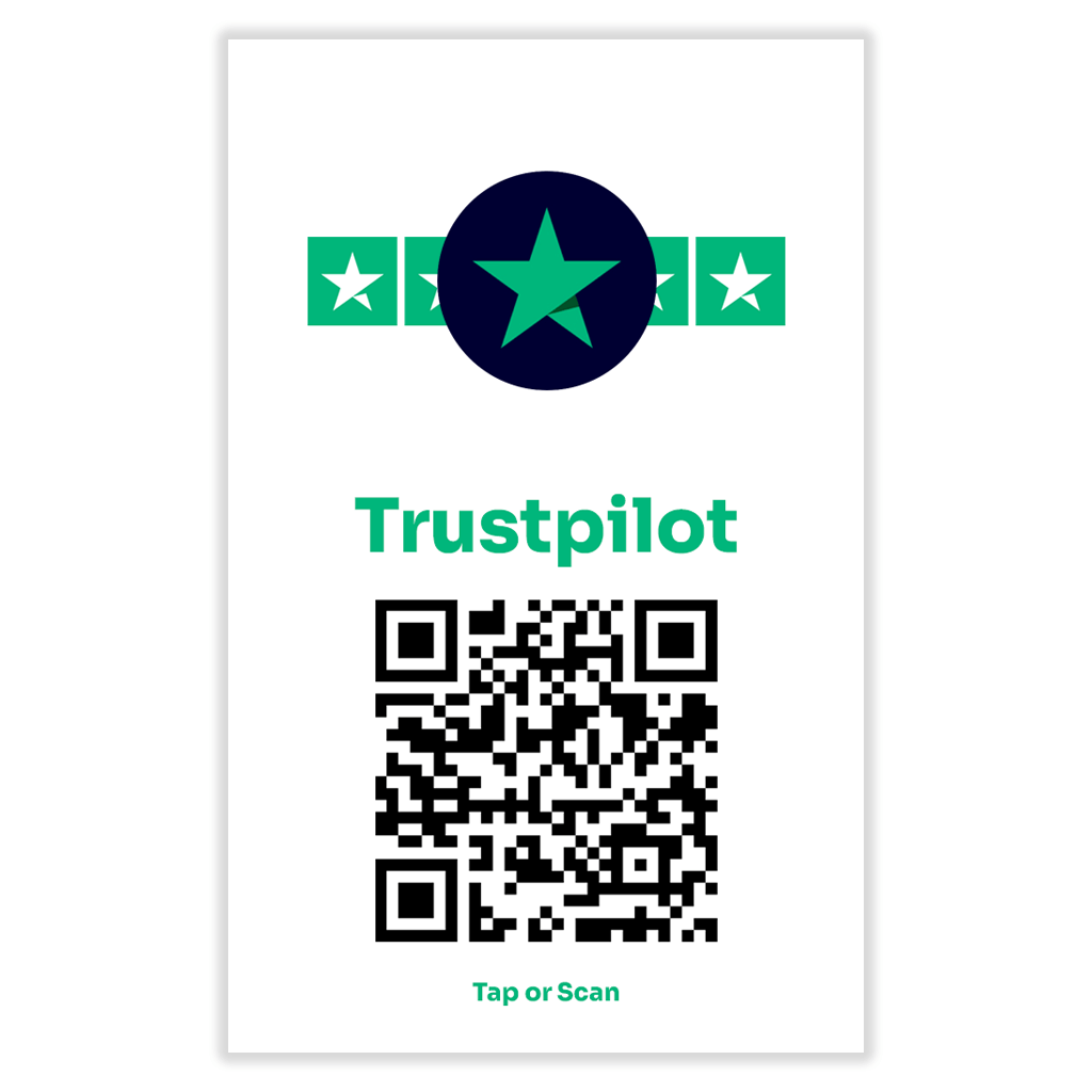 The NFC Trustpilot Tap Card is a modern review-request card combining NFC chip technology and a printed QR code (customised per card) to guide customers directly to your Trustpilot page. With one simple tap or scan, feedback is opened – no searching, no typing, no friction.